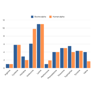 One of the key features of alpha-lactalbumin is its amino acid profile, which includes a relatively high tryptophan and cysteine content. The level of these amino acids in cow’s milk is around half that in human milk; however, bovine alpha-lactalbumin has a higher level of these key amino acids, thus can allow amino acid profiling of formula much closer to human milk (figure below).