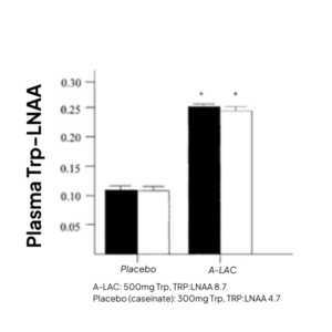 As little as 500mg has been shown to enhance the plasma TRP:LNAA levels by 48% against placebo, in both low- and high-stress vulnerable subjects (figure 6 – Markus et al, 2000).