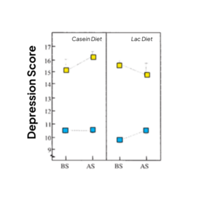 Change in depression scores before(BS) and after stress (AS) tests in high stress vulnerable and low stress vulnerable subjects. Split into casein and alpha-lac diet