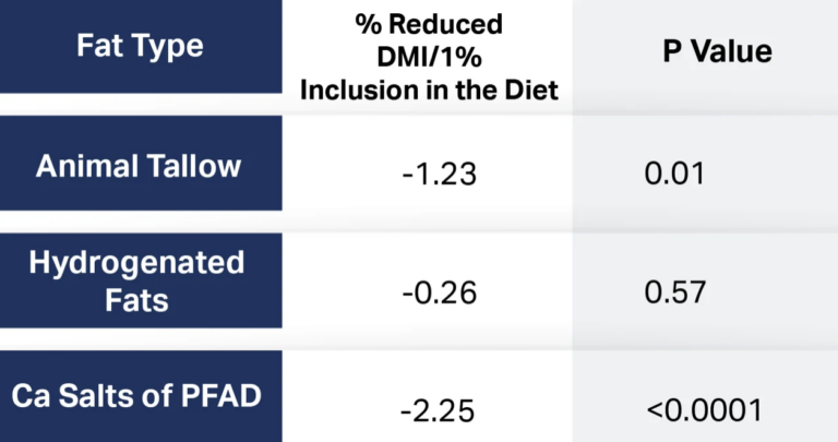 These published reports show the mechanism by which specific FA such as palmitic and oleic cause increases in CCK when fed to lactating cows. This in turn may lead to depressed DMI. To further investigate this hormonally modulated effect, a meta-analysis performed by Sellers et al. 2017 compared FA sources to the control. These findings are in Table 4.
