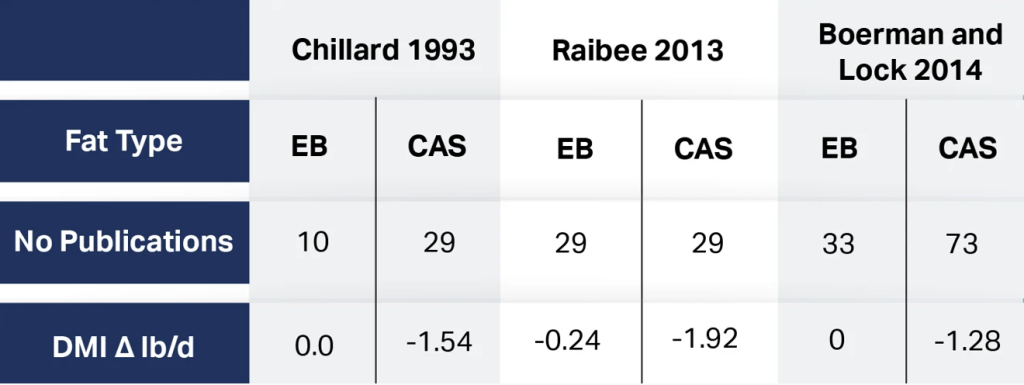 Published research work by Relling and Reynolds 2007 and Bradford et al 2008 in lactating dairy cows has shown similar results comparing EB 100 to CAS. EB 100 is a FA source containing mostly saturated FA high in stearic acid while CAS is primarily palmitic and oleic acids. CAS significantly increased CCK while EB 100 was similar to the control. Piantoni et al 2013 observed a significant increase in CCK comparing an 85% palmitic acid FA source to the control. These data suggest that FA sources high in palmitic and oleic acids increase CCK potentially leading to DMI depression, while a FA source high in stearic acid does not. These reports are shown in Table 3.