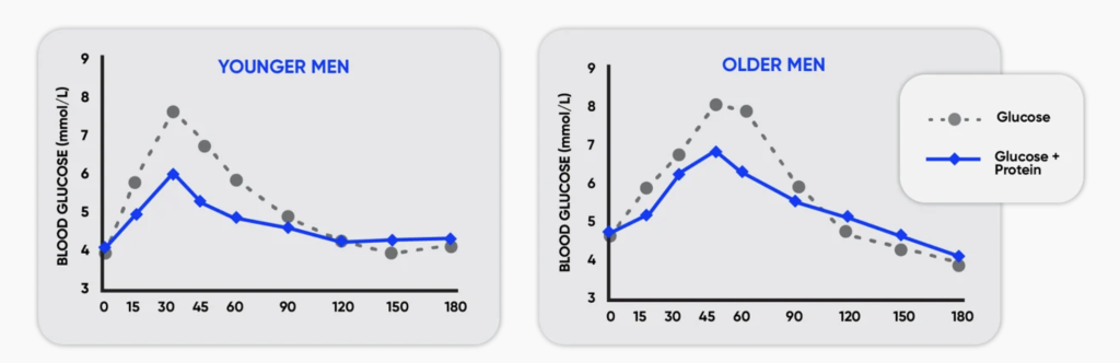 The results showed that co-ingestion of protein with glucose significantly reduced the increase in blood glucose concentrations compared to glucose alone in both younger and older men (see graph). Furthermore, it had a synergistic effect on increases in insulin concentration, regardless of age. Peak insulin concentrations after protein were unaffected by age.