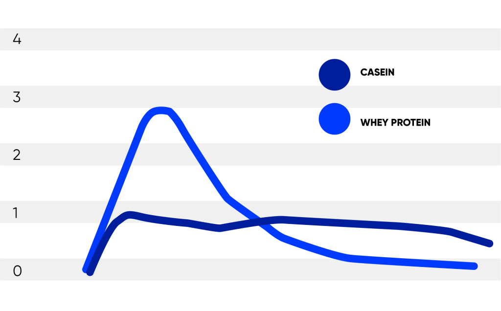 Casein, the main protein in milk protein concentrates and isolates, is also a great source of essential amino acids but is absorbed more slowly by the body (graph source: Boirie, Y, et al. Proc Natl Acad Sci USA 1997). This has the benefit of supplying the body with essential amino acids over a longer period and is why casein or milk protein is often found in overnight recovery products.